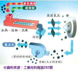 目前碳粉製造主要採用粉碎法和化學法。粉碎碳粉製備原理如圖一所示,樹脂與顏料顆粒、潤滑劑、電荷控制劑等經加熱、混練、熔融後押出冷卻,然後利用高壓氣流使押出片互相撞擊而碎裂,將碳粉經粒徑分級,再加入添加劑後混合,即可產出商品。