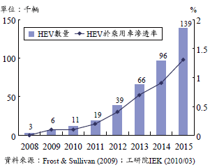 電動車可概略分為混合動力車(HEV)、插電式混合動力車(PHEV)與純電動車(BEV),目前最為普及的當屬HEV,累積至2008年為止,中國大陸市場合計約有7,000輛的銷售量。根據研究機構Frost & Sullivan的預測,中國大陸HEV市場將由2008年的3,249輛成長至2015年13.9萬輛,年複合成長率達71.1%,而HEV在乘用車市場的滲透率則由不到0.1%小幅成長至1.3%(圖二)。其達成的關鍵在於政府政策能否持續不斷地帶動市場的需求,且車廠是否因看好未來電動車的發展,願意大量投入資本、擴充產能並降低生產成本。