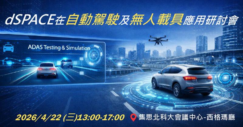 德國原廠技術直擊|ADAS 驗證 × 無人系統開發平台 閱讀網頁版 dSPACE 在自動駕駛及無人載具 應用研討會 誠摯地邀請您參加昊青公司與原廠合作舉辦的研討會。此次活動旨在探索和討論 dSPACE 在ADAS 領域的創新應用和技術解決方案及無人載具 RTMaps 開發平台介紹。 研討會內容包括: - ADAS 系統測試、模擬和驗證策略 - RTMaps data-driven 為主的無人系統,高效率的的開發工具 - 客戶使用 dSPACE 心得分享 活動時間: 2026/04/22 (三) 13:00-17:00 地點: 集思北科大會議中心 - 西格瑪廳 (台北市大安區忠孝東路三段1號億光大樓3樓) 議程: 13:00 - 13:30 報到 13:30 - 13:40 無人載具研究發展 Total Solution 13:40 - 15:00 dSPACE 在無人駕駛(ADAS/AD ) HIL 最佳驗証平台 15:00 - 15:30 dSPACE RTMaps AI 無人載具整合性開發環境 15:30 - 15:50 交流時間 15:50 - 16:50 客戶使用 dSPACE 心得分享 16:50 - 17:00 結尾Q&A 講師介紹: dSPACE 德國客戶經理及工程師 * 本活動免費參加,因席位有限敬請儘早註冊,歡迎業界專家及學者報名參加,昊青公司保留報名資格最後審核權。 免費報名 Scientific Formosa Inc 2026 All Rights Reserved 104 台北市中山區復興北路354號11樓 免付費電話: 0800-099-900 傳真 : (02) 2503-1680 聯絡信箱 : info@sciformosa.com.tw