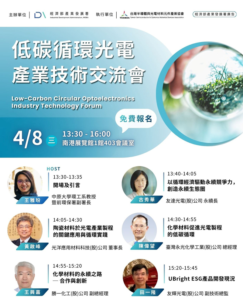 無法正常瀏覽內容,請點選此線上閱讀 2026. 3 . 19 取消訂閱 解密指標企業的「低碳循環」實戰路徑! 4/8低碳循環光電技術交流會 不僅分享領先企業如何將低碳思維植入營運核心,更將介紹具備循環經濟基因的創新光電產品。 交流會特別邀請5大指標企業,包含友達光電、光洋應材、臺灣永光化學、 勝一化工、友輝光電現身說法,誠摯邀請您與產業先鋒對話, 看標竿企業如何從技術研發到末端回收,打造具備綠色競爭力的永續循環鏈, 攜手解鎖淨零轉型的成功路徑! 訂閱│推薦訂閱│取消訂閱